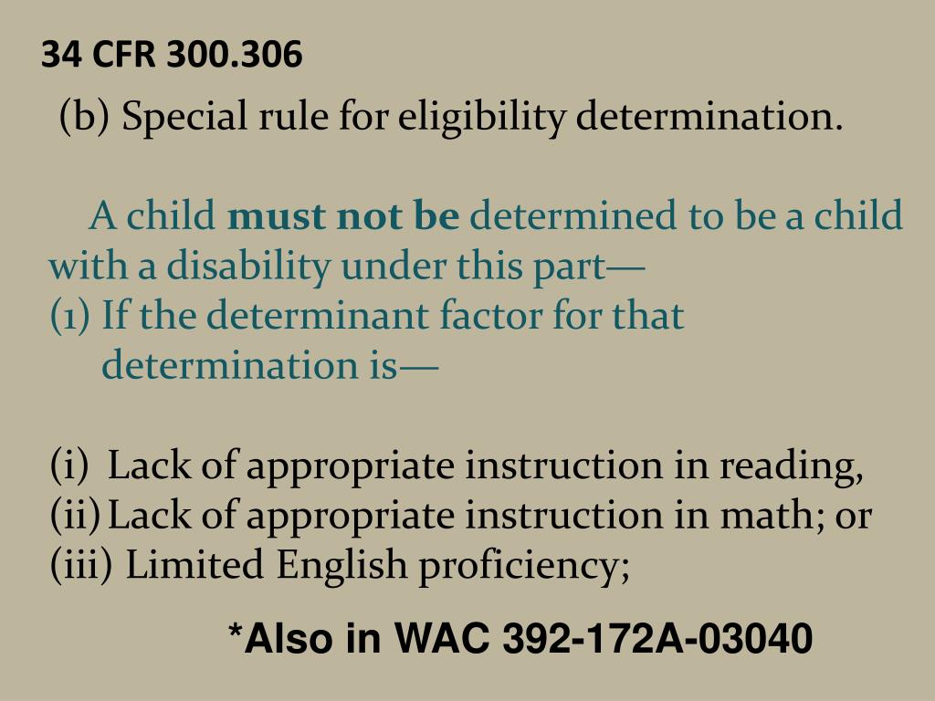 34 CFR 300.306 • (b) Special rule for eligibility determination. • A child must not be determined to be a child • with a disability under this part— • If the determinant factor for that determination is— • Lack of appropriate instruction in reading, • Lack of appropriate instruction in math; or • (iii) Limited English proficiency; *Also in WAC 392-172A-03040