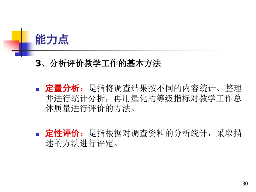 能力点 3、分析评价教学工作的基本方法 • 定量分析:是指将调查结果按不同的内容统计、整理并进行统计分析,再用量化的等级指标对教学工作总体质量进行评价的方法。 • 定性评价:是指根据对调查资料的分析统计,采取描述的方法进行评定。