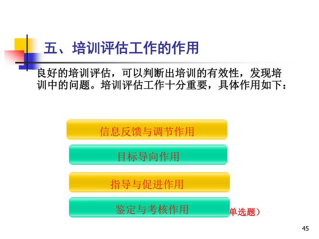 五、培训评估工作的作用 良好的培训评估,可以判断出培训的有效性,发现培训中的问题。培训评估工作十分重要,具体作用如下: (多选题、单选题) 信息反馈与调节作用 目标导向作用 指导与促进作用 鉴定与考核作用