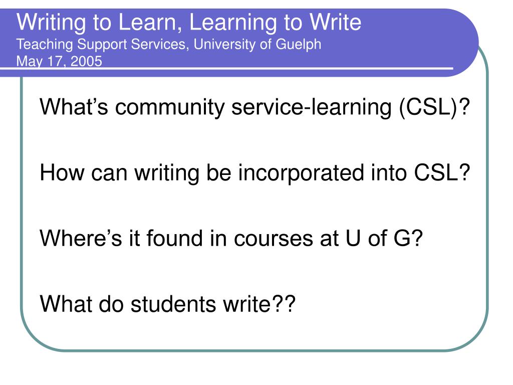 Writing to Learn, Learning to WriteTeaching Support Services, University of GuelphMay 17, 2005 What’s community service-learning (CSL)? How can writing be incorporated into CSL? Where’s it found in courses at U of G? What do students write??