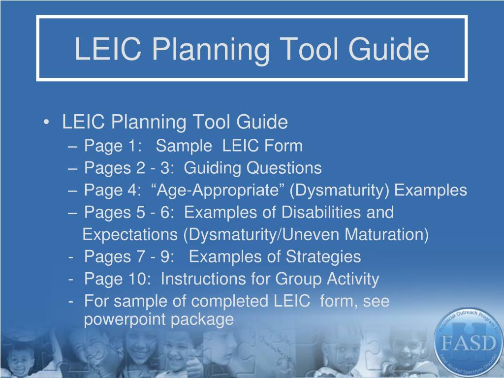 LEIC Planning Tool Guide • LEIC Planning Tool Guide • Page 1: Sample LEIC Form • Pages 2 - 3: Guiding Questions • Page 4: “Age-Appropriate” (Dysmaturity) Examples • Pages 5 - 6: Examples of Disabilities and Expectations (Dysmaturity/Uneven Maturation) • Pages 7 - 9: Examples of Strategies • Page 10: Instructions for Group Activity • For sample of completed LEIC form, see powerpoint package