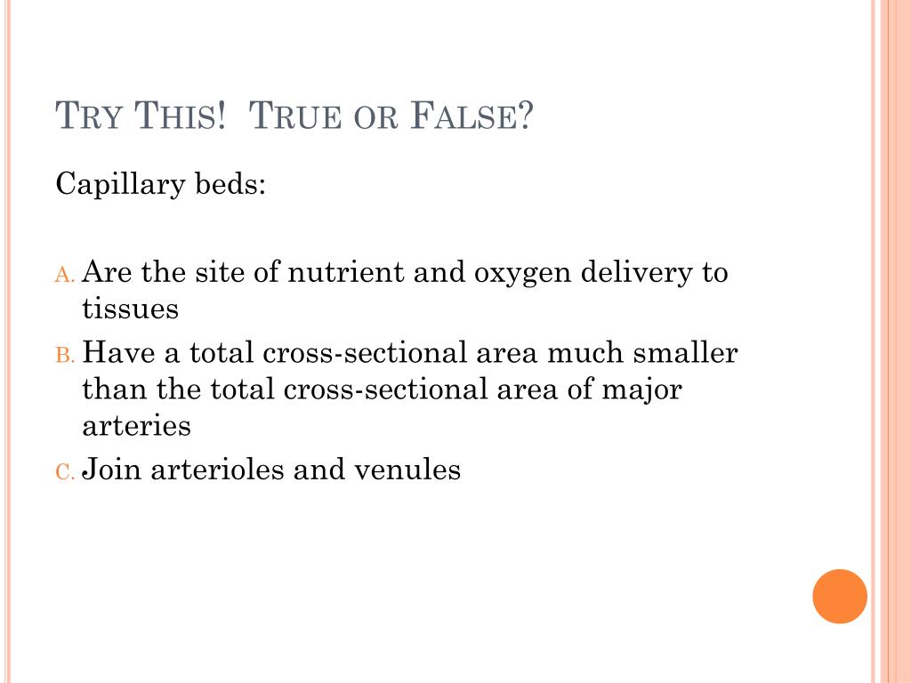 Try This! True or False? Capillary beds: • Are the site of nutrient and oxygen delivery to tissues • Have a total cross-sectional area much smaller than the total cross-sectional area of major arteries • Join arterioles and venules