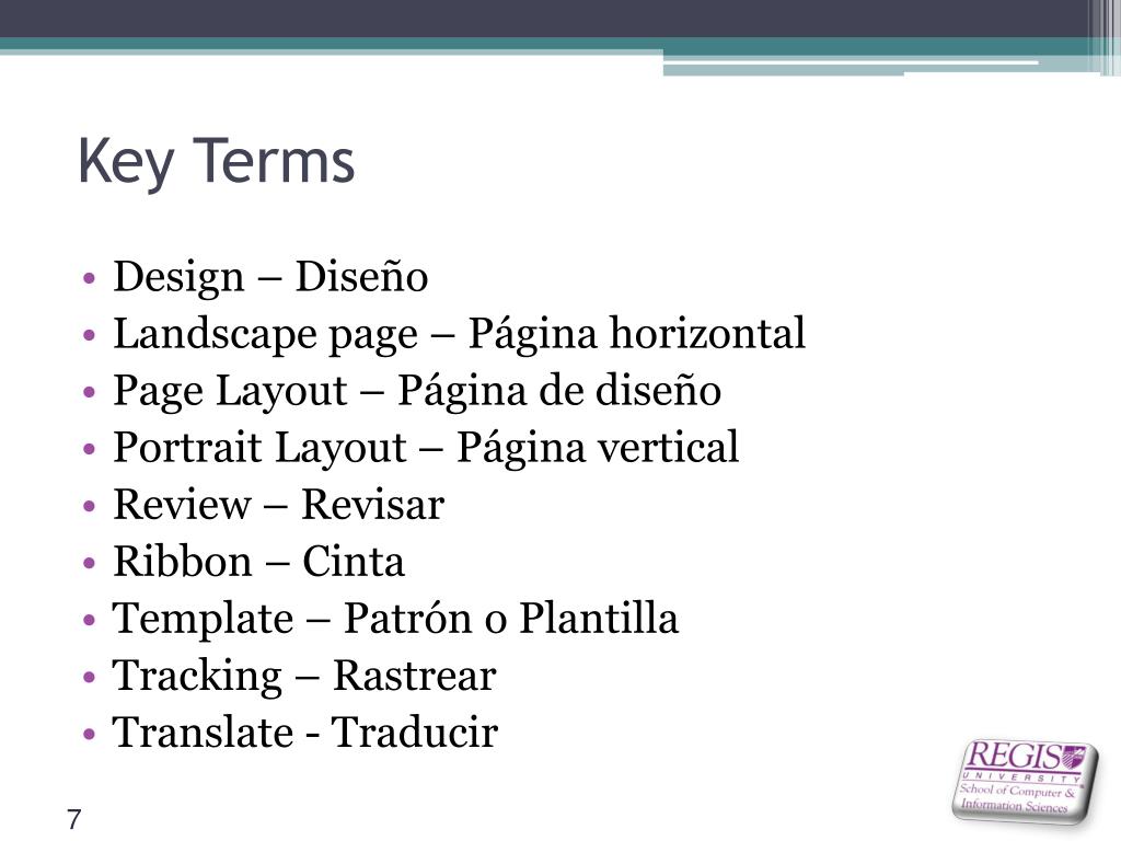 Key Terms Design – Diseño Landscape page – Página horizontal Page Layout – Página de diseño Portrait Layout – Página vertical Review – Revisar Ribbon – Cinta Template – Patrón o Plantilla Tracking – Rastrear Translate - Traducir