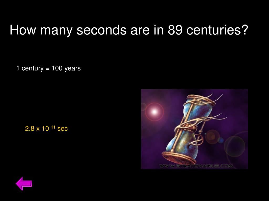 How many seconds are in 89 centuries? 1 century = 100 years 2.8 x 10 11 sec