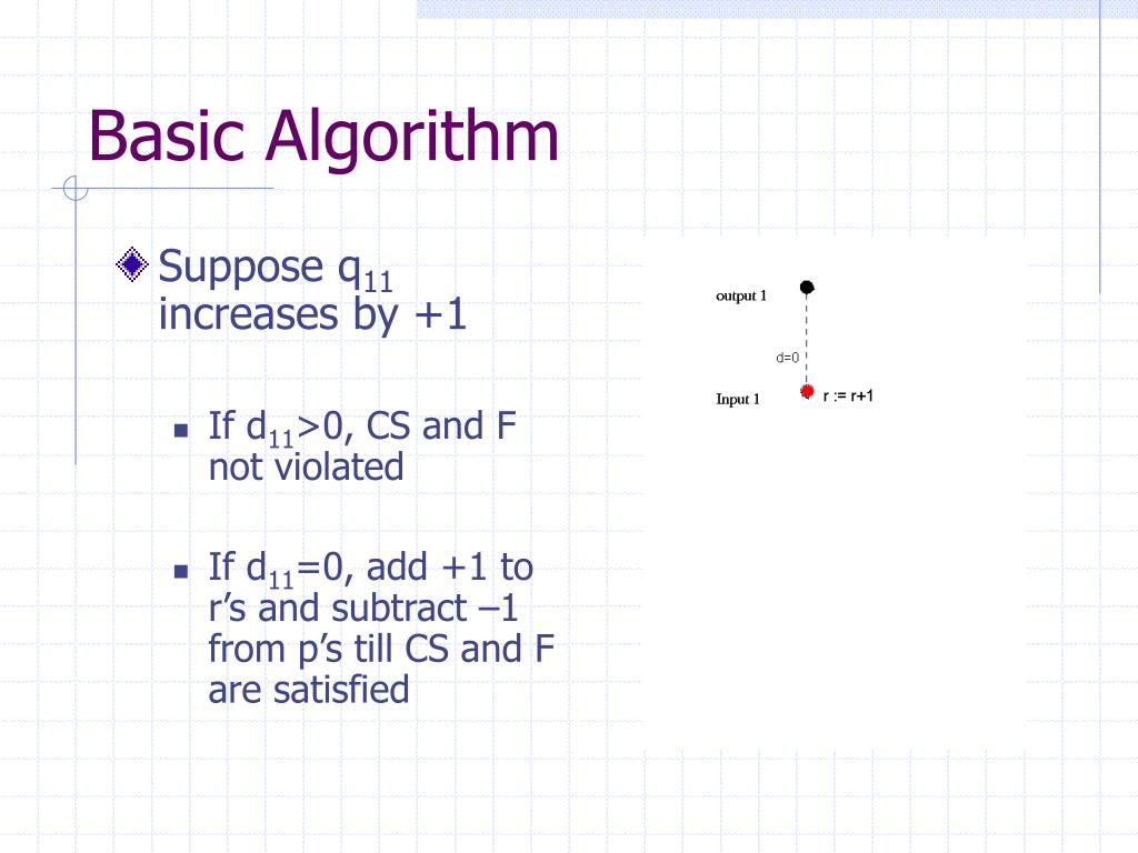 Basic Algorithm • Suppose q11 increases by +1 • If d11>0, CS and F not violated