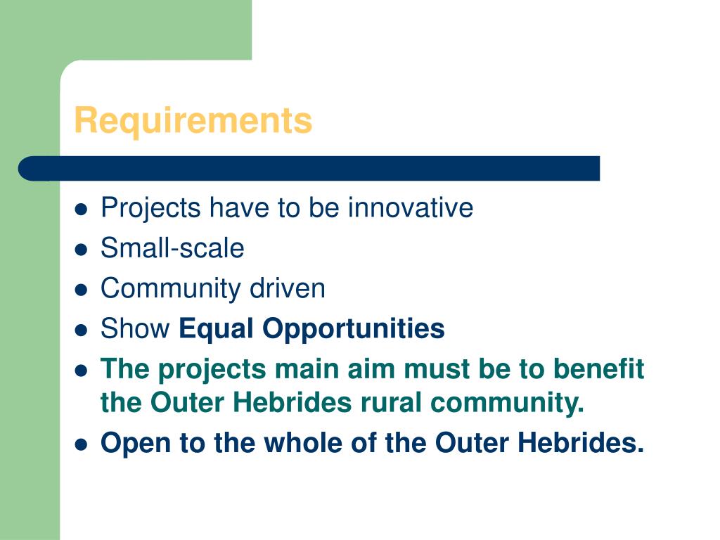 Requirements • Projects have to be innovative • Small-scale • Community driven • Show Equal Opportunities • The projects main aim must be to benefit the Outer Hebrides rural community. • Open to the whole of the Outer Hebrides.
