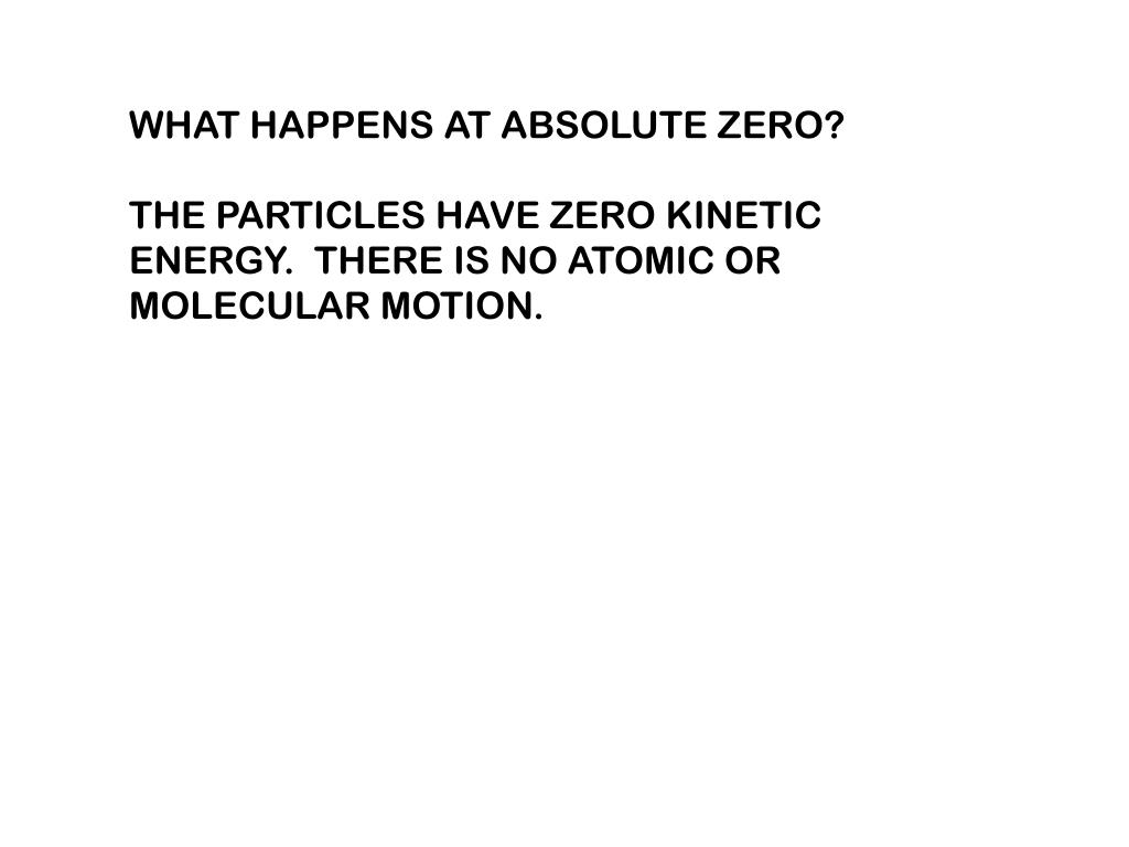 WHAT HAPPENS AT ABSOLUTE ZERO? THE PARTICLES HAVE ZERO KINETIC ENERGY. THERE IS NO ATOMIC OR MOLECULAR MOTION.