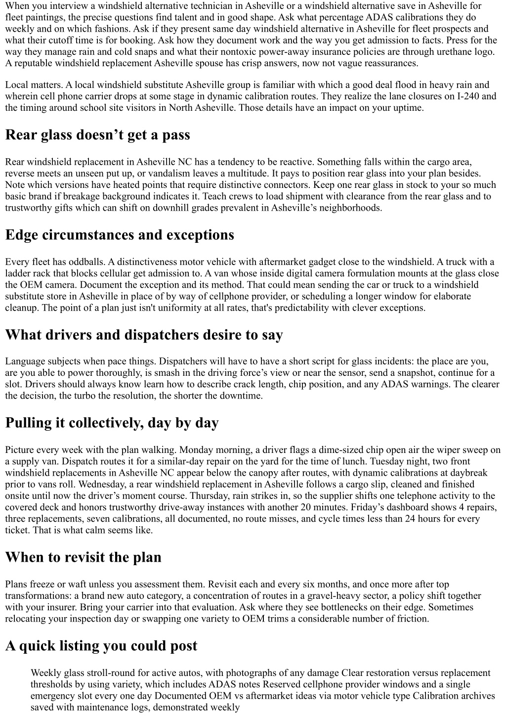stunning haze. The restore isn’t invariably replacement, yet you need to compare glare court cases significantly. A driving force who stories halos round headlights on Patton Avenue at 6 p.m. is telling you the glass is beyond its dependable existence. Build a seasonal fee for pitting and haze, and be well prepared to exchange borderline models before the time difference whilst dark commutes return. Construction round River Arts District and new builds close South Asheville generate debris. Route your so much fragile so much faraway from energetic sites if achieveable. If no longer, teach drivers to elevate spacing at the back of dump vans and gravel haulers. Small conduct lower chips. For rural segments, remind crews to sluggish rather on free shoulder places and evade useless lane changes where gravel swimming pools. One more local quirk, pine sap. Parked below trees near activity websites or in older neighborhoods, vans acquire sap which will wreck wipers and smear glass. Keep washing machine fluid topped with a solvent that handles biological residue, and switch wiper blades proactively. Streaky blades don’t just annoy drivers, they can conceal small chips that you might have caught early. OEM vs aftermarket: a sensible call There is a time for OEM windshield alternative in Asheville and a time for well‑made aftermarket glass. If a car has a finicky camera mount or you have had repeat calibration issues with a selected variety, OEM customarily solves the headache. The glass curvature and bracket placement tolerances should be would becould very well be tighter, and that allows the digicam see what it expects. For non‑sensor cars and plenty gentle vehicles, reliable aftermarket glass performs all right at a friendlier price. The traps to steer clear of are the cut price containers. Cheap windshield replacement in Asheville typically appears useful on a quote yet expenses you twice in transform, water leaks, or wind noise that drives your team crazy on lengthy routes to Hendersonville. A honest phrase is reasonable windshield replacement in Asheville. You choose significance, not the lowest bid. Ask your provider which aftermarket manufacturers they consider for truck windshield substitute in Asheville and SUV windshield alternative in Asheville, and why. Their resolution ought to be extraordinary, with company names and factors, not “They’re all the equal.” Calibration logistics, documented Treat calibration as its own task. After front windshield replacement in Asheville NC, the technician ought to run pre‑ and post‑scans, complete static or dynamic calibration as certain, and produce bureaucracy or a electronic listing that lists car VIN, mileage, software adaptation, target placements if static, path particulars if dynamic, and cross popularity. Store those files along with your protection logs. If a driving force stories a lane prevent warning later, you have got a transparent trail. For fleets that function after dark, plan dynamic calibrations on riskless, neatly‑marked roads with minimum traffic. Early mornings on Brevard Road or sections close the Outlet Mall can paintings. Avoid steep grades or heavy cover if your fashion’s manner requires constant lane markings and open sky. Weather delays are genuine within the mountains, so shop a backup slot the following day.