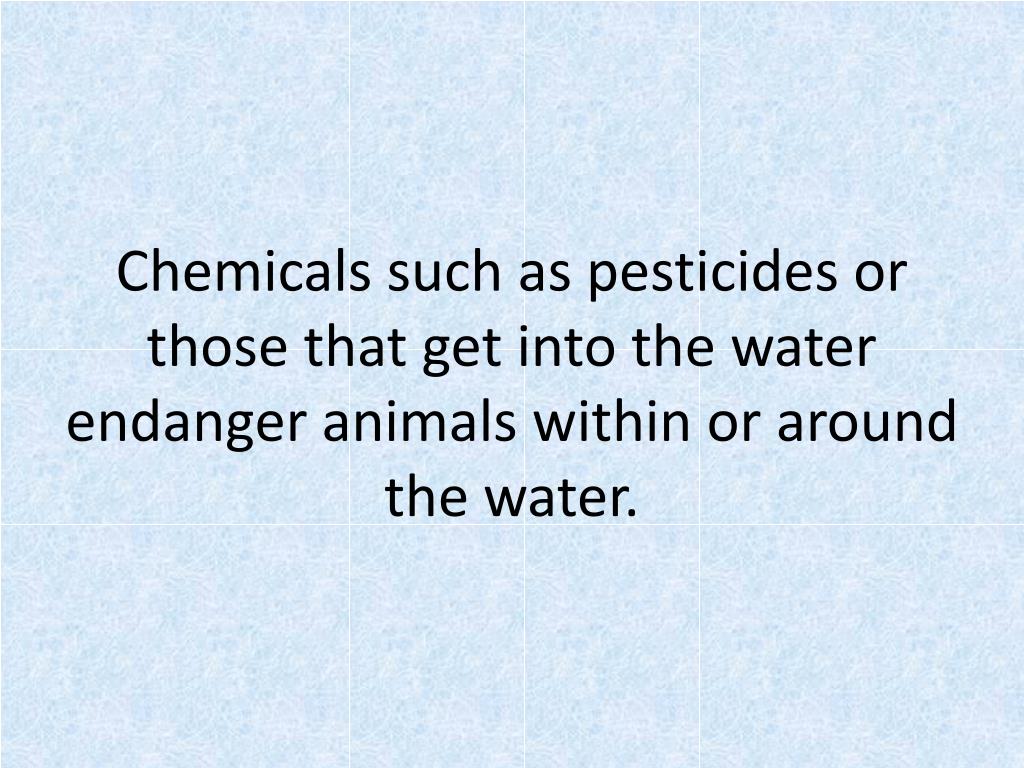 Chemicals such as pesticides or those that get into the water endanger animals within or around the water.