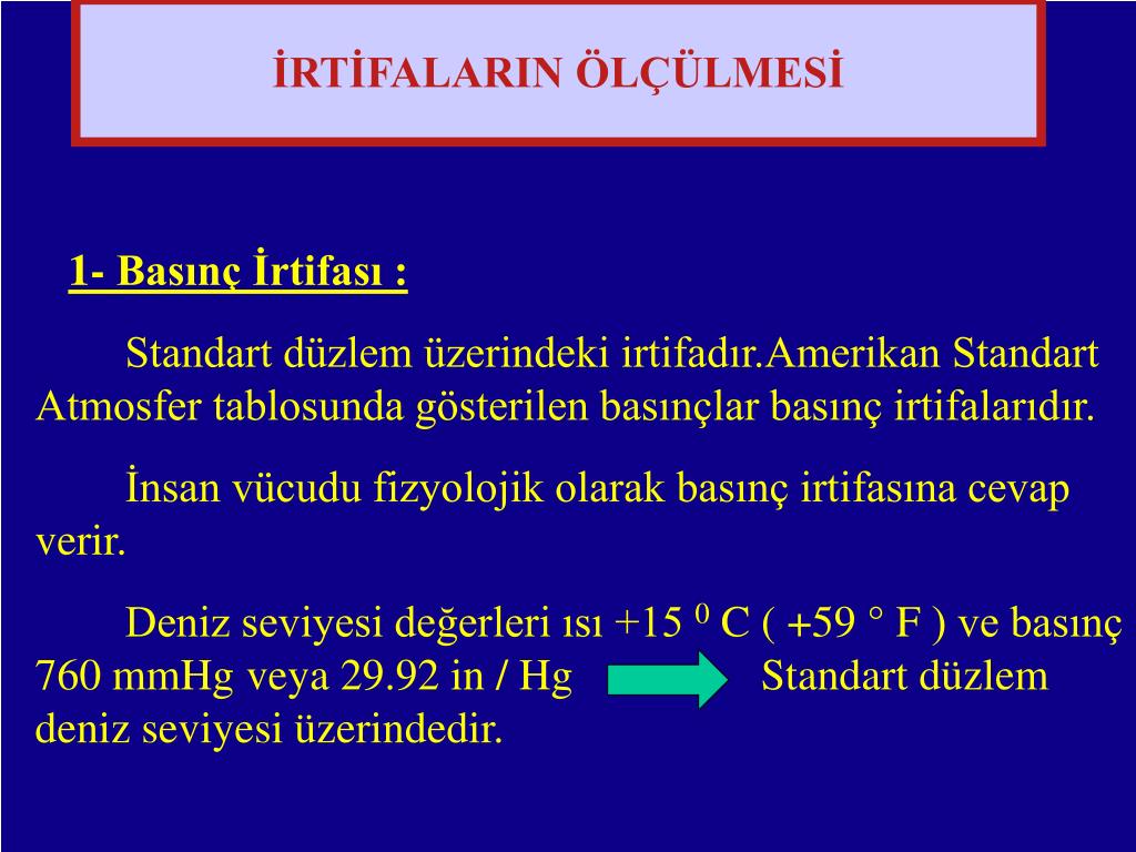 İRTİFALARIN ÖLÇÜLMESİ 1- Basınç İrtifası : Standart düzlem üzerindeki irtifadır.Amerikan Standart Atmosfer tablosunda gösterilen basınçlar basınç irtifalarıdır. İnsan vücudu fizyolojik olarak basınç irtifasına cevap verir. Deniz seviyesi değerleri ısı +15 0 C ( +59 ° F ) ve basınç 760 mmHg veya 29.92 in / Hg Standart düzlem deniz seviyesi üzerindedir.