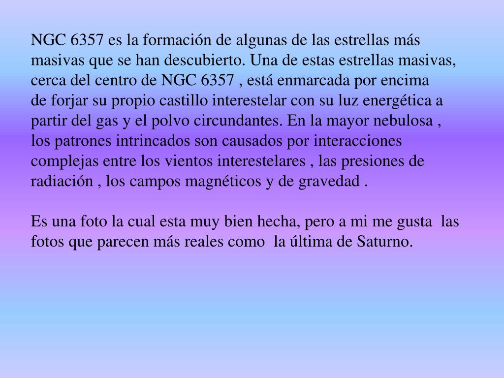 NGC 6357 es la formación de algunas de las estrellas más masivas que se han descubierto. Una de estas estrellas masivas, cerca del centro de NGC 6357 , está enmarcada por encima de forjar su propio castillo interestelar con su luz energética a partir del gas y el polvo circundantes. En la mayor nebulosa , los patrones intrincados son causados por interacciones complejas entre los vientos interestelares , las presiones de radiación , los campos magnéticos y de gravedad . Es una foto la cual esta muy bien hecha, pero a mi me gusta las fotos que parecen más reales como la última de Saturno.