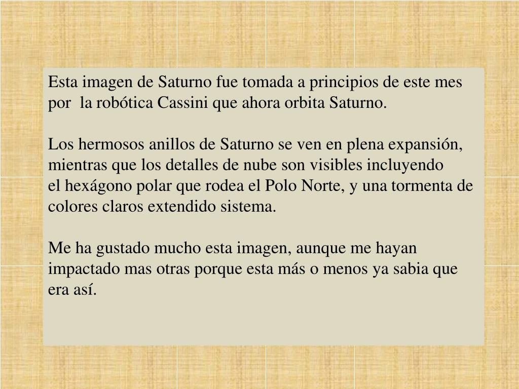 Esta imagen de Saturno fue tomada a principios de este mes por la robótica Cassini que ahora orbita Saturno. Los hermosos anillos de Saturno se ven en plena expansión, mientras que los detalles de nube son visibles incluyendo el hexágono polar que rodea el Polo Norte, y una tormenta de colores claros extendido sistema. Me ha gustado mucho esta imagen, aunque me hayan impactado mas otras porque esta más o menos ya sabia que era así.
