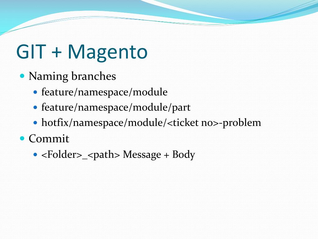 GIT + Magento • Naming branches • feature/namespace/module • feature/namespace/module/part • hotfix/namespace/module/<ticket no>-problem • Commit • <Folder>_<path> Message + Body