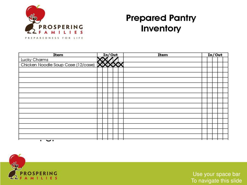 Print copies of the Pantry Inventory & Freezer Inventory worksheets from this Program • Inventory everything you have in your pantry, fridge, freezer, cabinets, closets, storage, etc. • Compare your Inventory Lists with your new Master Menu Ingredient/Shopping Lists from both the Preparedness for Life Series and FSP Use your space bar To navigate this slide
