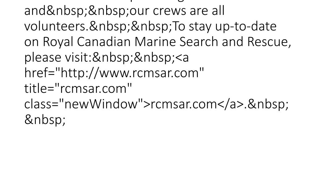 <br /> The Canadian Coast Guard Auxiliary -Pacific rebranded to Royal Canadian Marine Search and Rescue in May 2012 to reiterate the fact that we are a non profit organization and our crews are all volunteers. To stay up-to-date on Royal Canadian Marine Search and Rescue, please visit: <a href="http://www.rcmsar.com" title="rcmsar.com" class="newWindow">rcmsar.com</a>.