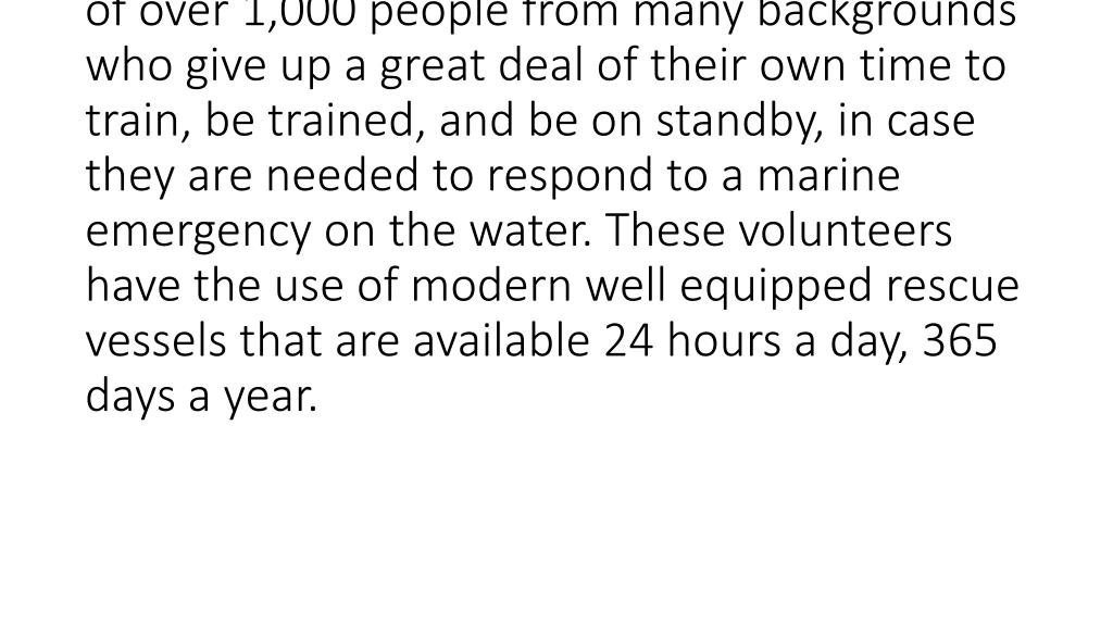 <br /> It is a challenge to provide search and rescue response capability to such a large area, and our volunteers meet the challenge with determination and professionalism, and assist those in peril on the sea.