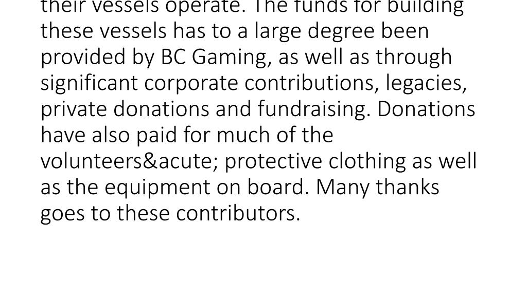 <br /> The rescue vessels used are, for the most part, rigid hull inflatables. Most of the fleet of 41 vessels are less than 5 years old, and owned by societies local to the area where their vessels operate. The funds for building these vessels has to a large degree been provided by BC Gaming, as well as through significant corporate contributions, legacies, private donations and fundraising. Donations have also paid for much of the volunteers´ protective clothing as well as the equipment on board. Many thanks goes to these contributors.