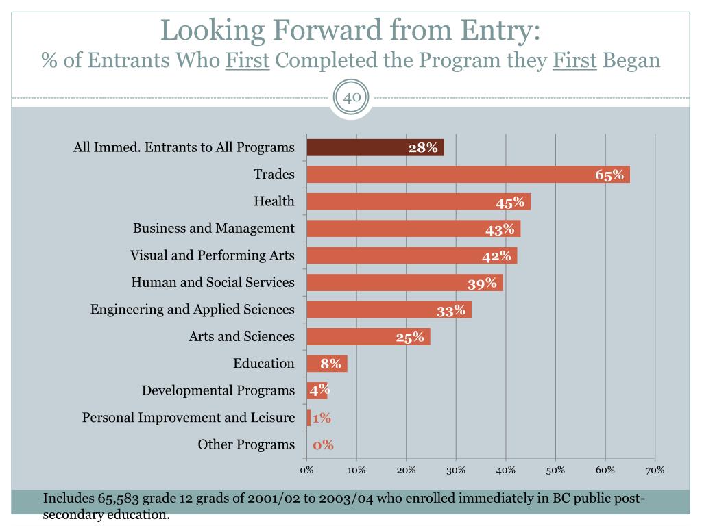 Looking Forward from Entry: % of Entrants Who First Completed the Program they First Began Includes 65,583 grade 12 grads of 2001/02 to 2003/04 who enrolled immediately in BC public post-secondary education.