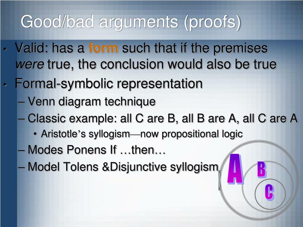 Good/bad arguments (proofs) • Valid: has a form such that if the premises were true, the conclusion would also be true • Formal-symbolic representation • Venn diagram technique • Classic example: all C are B, all B are A, all C are A • Aristotle’s syllogism—now propositional logic • Modes Ponens If …then… • Model Tolens &Disjunctive syllogism A B C