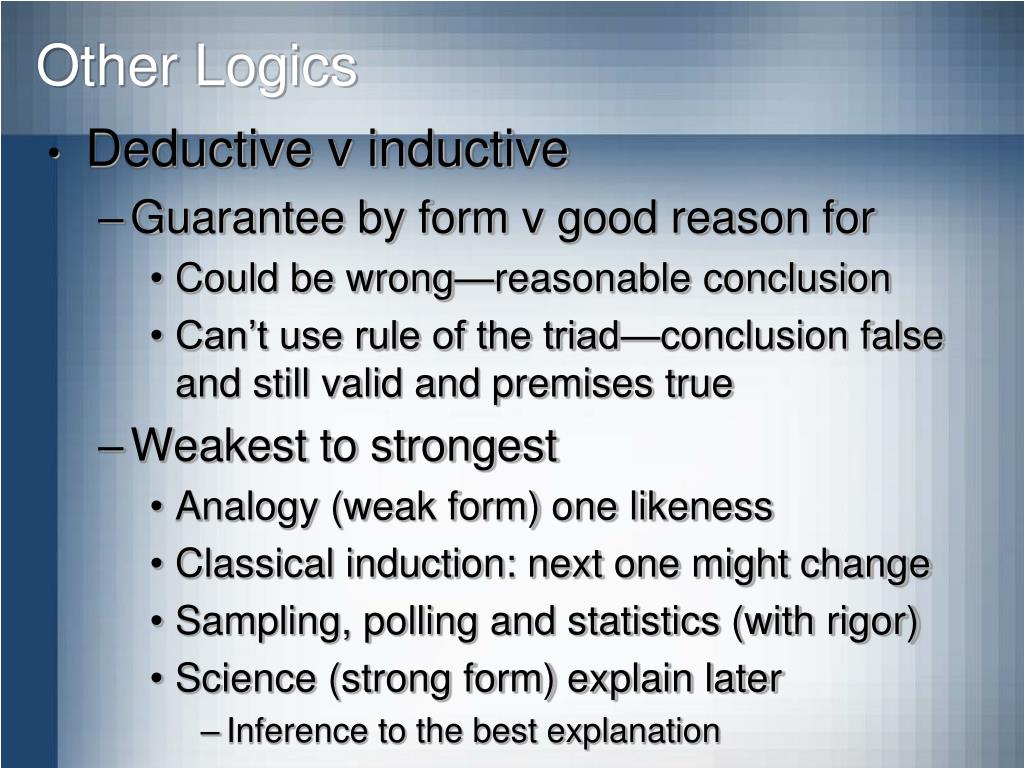 Other Logics • Deductive v inductive • Guarantee by form v good reason for • Could be wrong—reasonable conclusion • Can’t use rule of the triad—conclusion false and still valid and premises true • Weakest to strongest • Analogy (weak form) one likeness • Classical induction: next one might change • Sampling, polling and statistics (with rigor) • Science (strong form) explain later • Inference to the best explanation