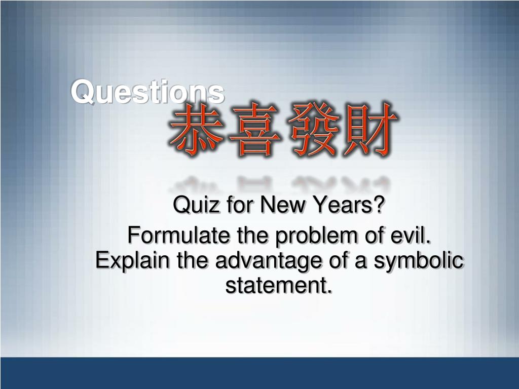 Questions 恭喜發財 Quiz for New Years? Formulate the problem of evil. Explain the advantage of a symbolic statement.