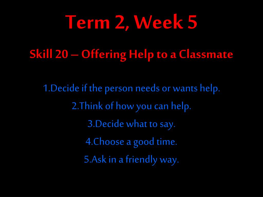 Term 2, Week 5 Skill 20 – Offering Help to a Classmate • Decide if the person needs or wants help. • Think of how you can help. • Decide what to say. • Choose a good time. • Ask in a friendly way.