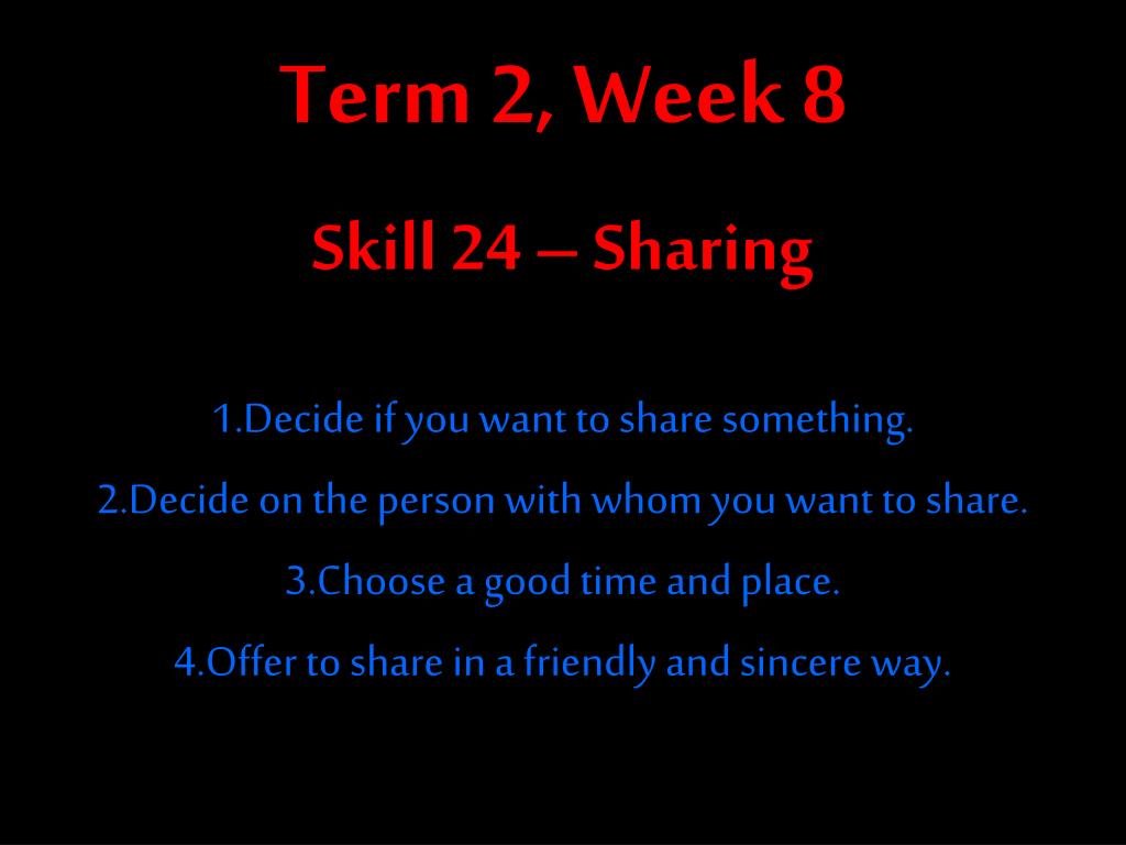 Term 2, Week 8 Skill 24 – Sharing • Decide if you want to share something. • Decide on the person with whom you want to share. • Choose a good time and place. • Offer to share in a friendly and sincere way.