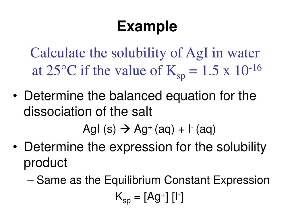 Example Calculate the solubility of AgI in water at 25°C if the value of Ksp = 1.5 x 10-16 • Determine the balanced equation for the dissociation of the salt AgI (s) Ag+ (aq) + I- (aq) • Determine the expression for the solubility product • Same as the Equilibrium Constant Expression Ksp = [Ag+] [I-]