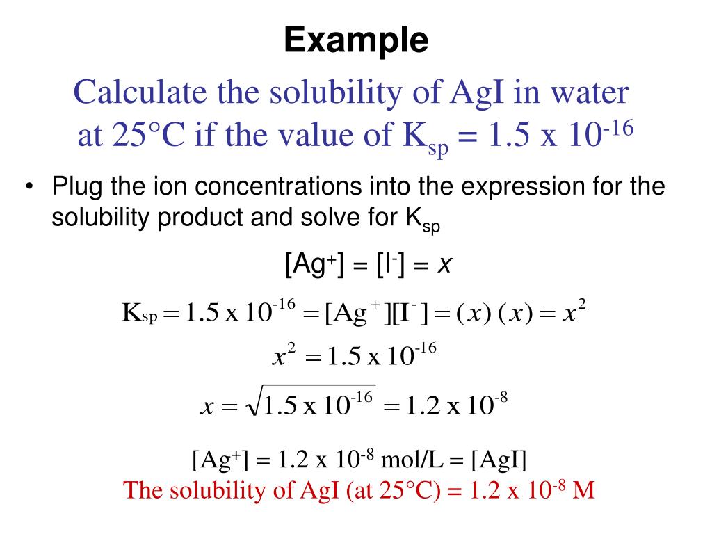 Example Calculate the solubility of AgI in water at 25°C if the value of Ksp = 1.5 x 10-16 • Plug the ion concentrations into the expression for the solubility product and solve for Ksp [Ag+] = [I-] = x [Ag+] = 1.2 x 10-8 mol/L = [AgI] The solubility of AgI (at 25°C) = 1.2 x 10-8 M
