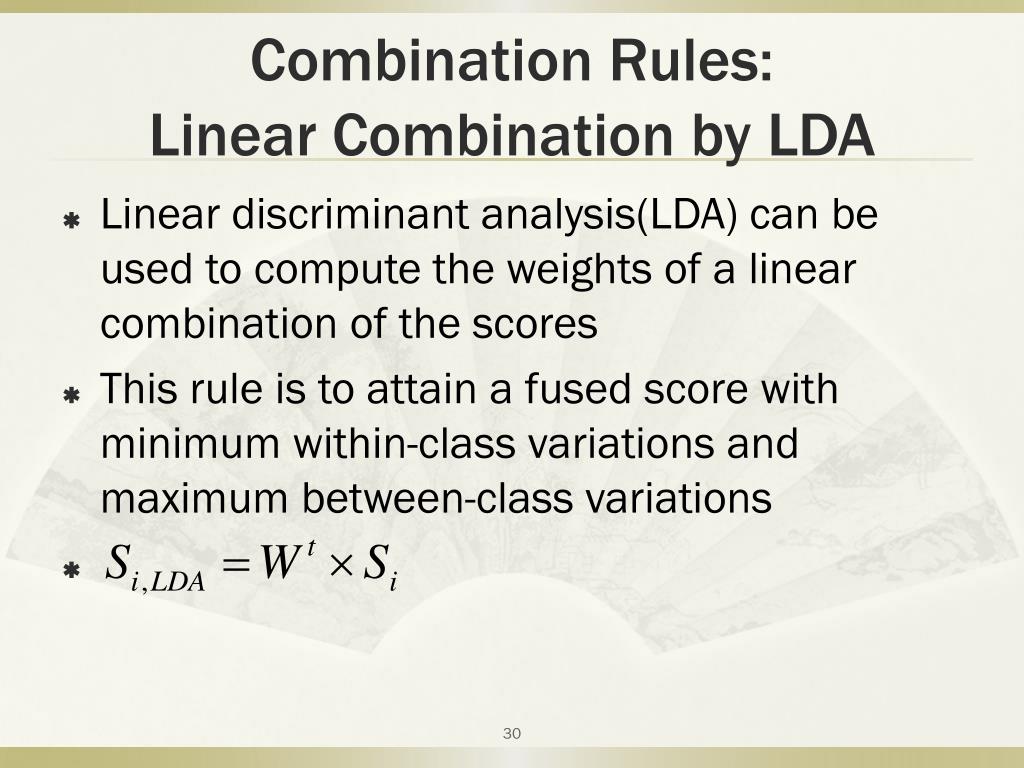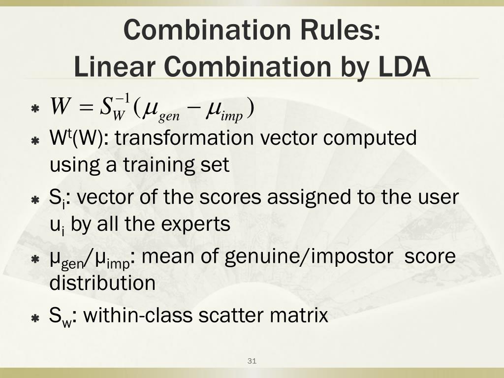 Combination Rules: Linear Combination by LDA Linear discriminant analysis(LDA) can be used to compute the weights of a linear combination of the scores This rule is to attain a fused score with minimum within-class variations and maximum between-class variations