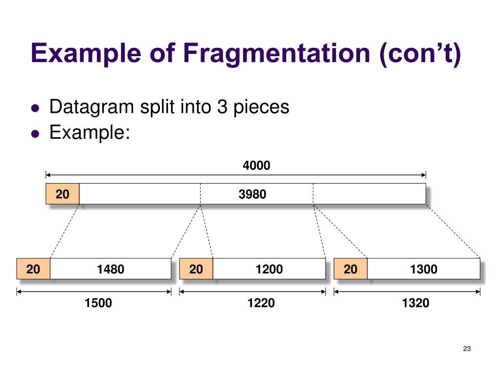 20 1480 20 1200 20 1300 1500 1220 1320 Example of Fragmentation (con’t) • Datagram split into 3 pieces • Example: 4000 20 3980