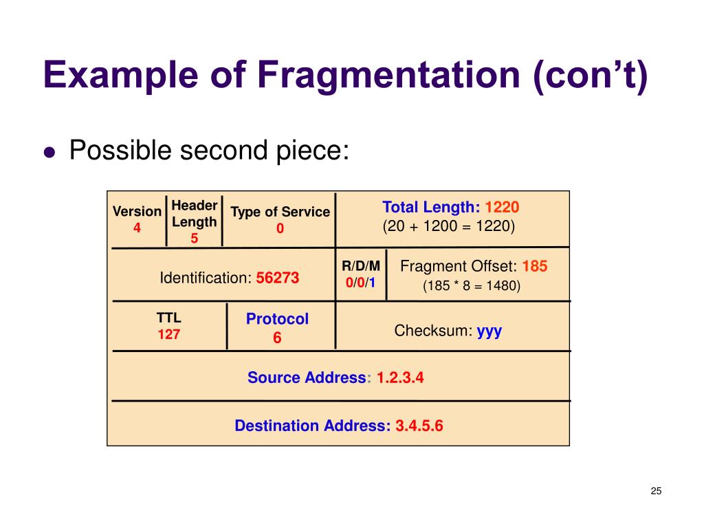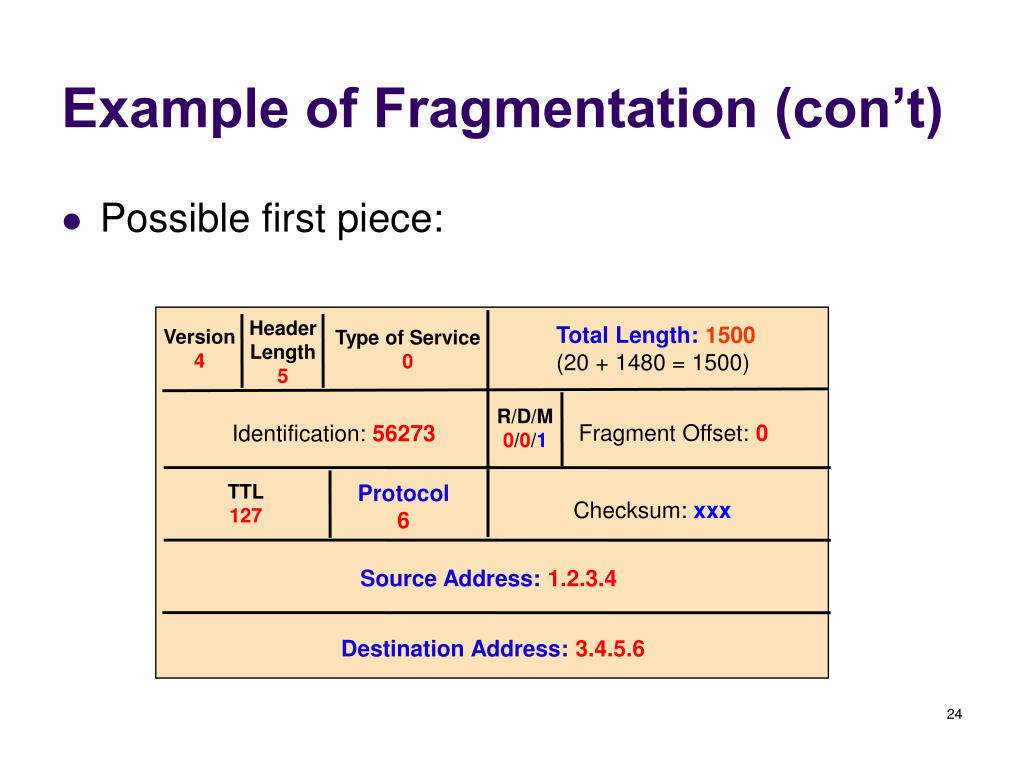 Example of Fragmentation (con’t) • Possible third piece: Header Length 5 Version 4 Type of Service 0 Total Length:1320 (20 + 3880 – 2680 = 1320) Fragment Offset: 335 (335 * 8 = 2680) R/D/M 0/0/0 Identification: 56273 Protocol 6 TTL 127 Checksum: zzz Source Address:1.2.3.4 Destination Address:3.4.5.6