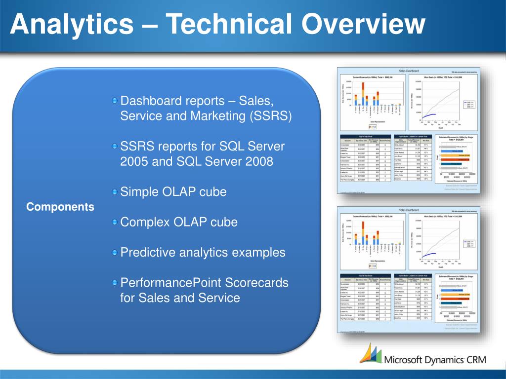 The Forrester Wave : Enterprise CRM Suite Microsoft Dynamics CRM - Vendor profile by Forrester: • Flexibility • Desktop applications strength • More-robust business applications • Strategy for growth: choice of deployment (+ same code & migration), flexible user interface, choice of payment options, and a strong partner community. • Buyer interest already high in SMB and growing in Enterprise segment • Sound capabilities in sales, marketing, and customer service • Extensive network of ISVs to develop industry solutions on Microsoft’s Dynamics platform. • Microsoft infrastructure equals lower TCO in buying and managing business technologies • Buyers like Microsoft Dynamics CRM's usability, lower price, and its quick time-to-value compared with traditional CRM applications.