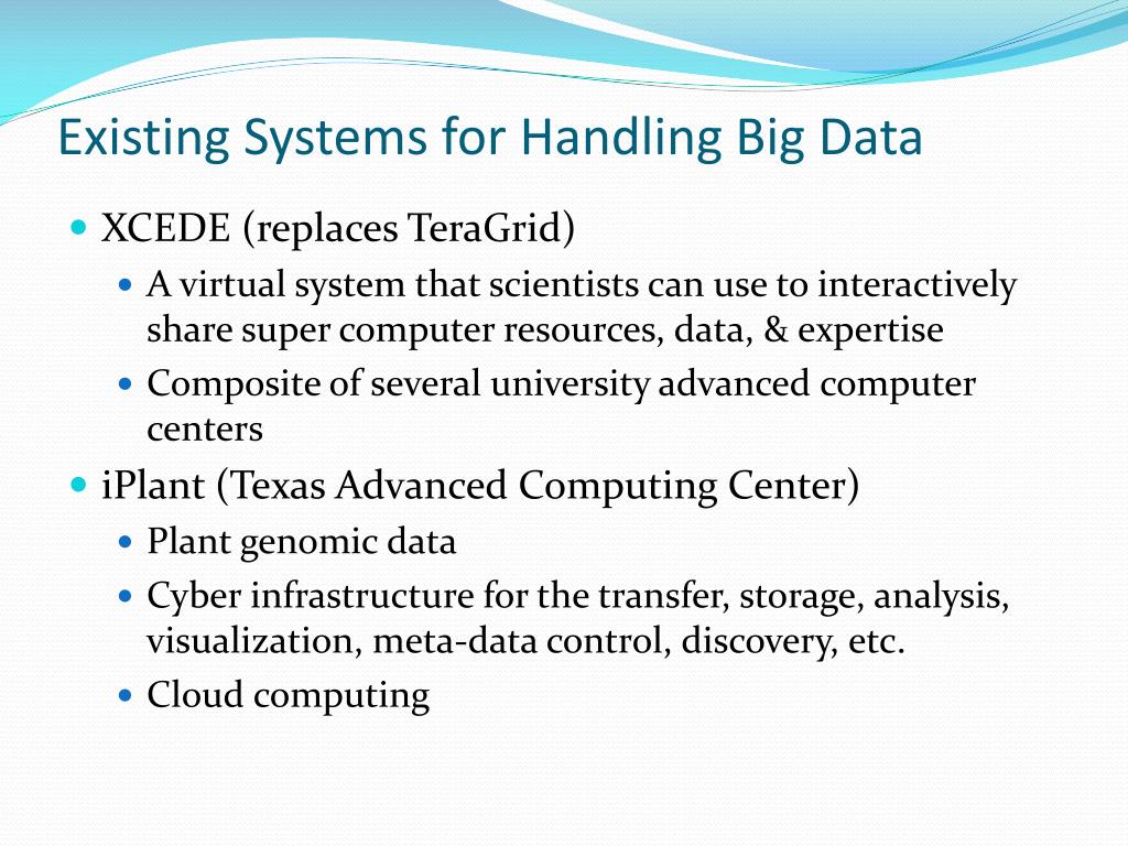 Existing Systems for Handling Big Data • XCEDE (replaces TeraGrid) • A virtual system that scientists can use to interactively share super computer resources, data, & expertise • Composite of several university advanced computer centers • iPlant (Texas Advanced Computing Center) • Plant genomic data • Cyber infrastructure for the transfer, storage, analysis, visualization, meta-data control, discovery, etc. • Cloud computing