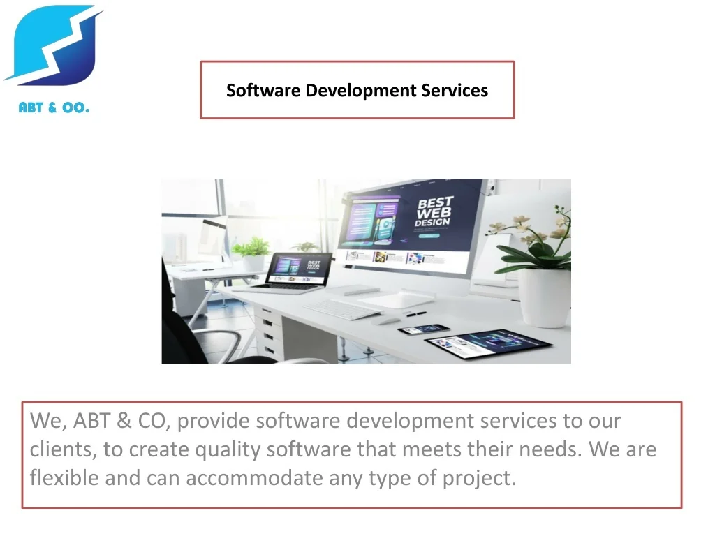 Software Development Services We, ABT & CO, provide software development services to our clients, to create quality software that meets their needs. We are flexible and can accommodate any type of project.