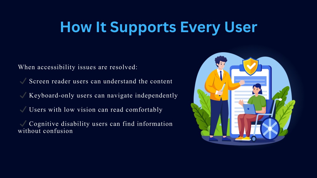 4. How It Supports Every User When accessibility issues are resolved: ✔ Screen reader users can understand the content ✔ Keyboard-only users can navigate independently ✔ Users with low vision can read comfortably ✔ Cognitive disability users can find information without confusion