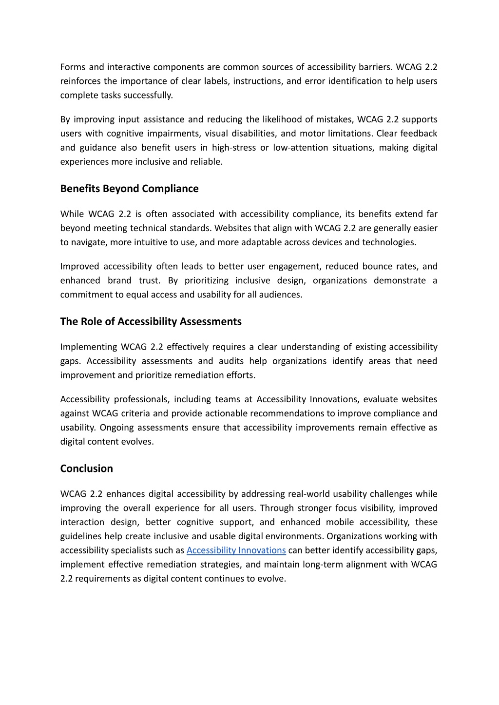 Forms and interactive components are common sources of accessibility barriers. WCAG 2.2 reinforces the importance of clear labels, instructions, and error identification to help users complete tasks successfully. By improving input assistance and reducing the likelihood of mistakes, WCAG 2.2 supports users with cognitive impairments, visual disabilities, and motor limitations. Clear feedback and guidance also benefit users in high-stress or low-attention situations, making digital experiences more inclusive and reliable. Benefits Beyond Compliance While WCAG 2.2 is often associated with accessibility compliance, its benefits extend far beyond meeting technical standards. Websites that align with WCAG 2.2 are generally easier to navigate, more intuitive to use, and more adaptable across devices and technologies. Improved accessibility often leads to better user engagement, reduced bounce rates, and enhanced brand trust. By prioritizing inclusive design, organizations demonstrate a commitment to equal access and usability for all audiences. The Role of Accessibility Assessments Implementing WCAG 2.2 effectively requires a clear understanding of existing accessibility gaps. Accessibility assessments and audits help organizations identify areas that need improvement and prioritize remediation efforts. Accessibility professionals, including teams at Accessibility Innovations, evaluate websites against WCAG criteria and provide actionable recommendations to improve compliance and usability. Ongoing assessments ensure that accessibility improvements remain effective as digital content evolves. Conclusion WCAG 2.2 enhances digital accessibility by addressing real-world usability challenges while improving the overall experience for all users. Through stronger focus visibility, improved interaction design, better cognitive support, and enhanced mobile accessibility, these guidelines help create inclusive and usable digital environments. Organizations working with accessibility specialists such as Accessibility Innovations can better identify accessibility gaps, implement effective remediation strategies, and maintain long-term alignment with WCAG 2.2 requirements as digital content continues to evolve.