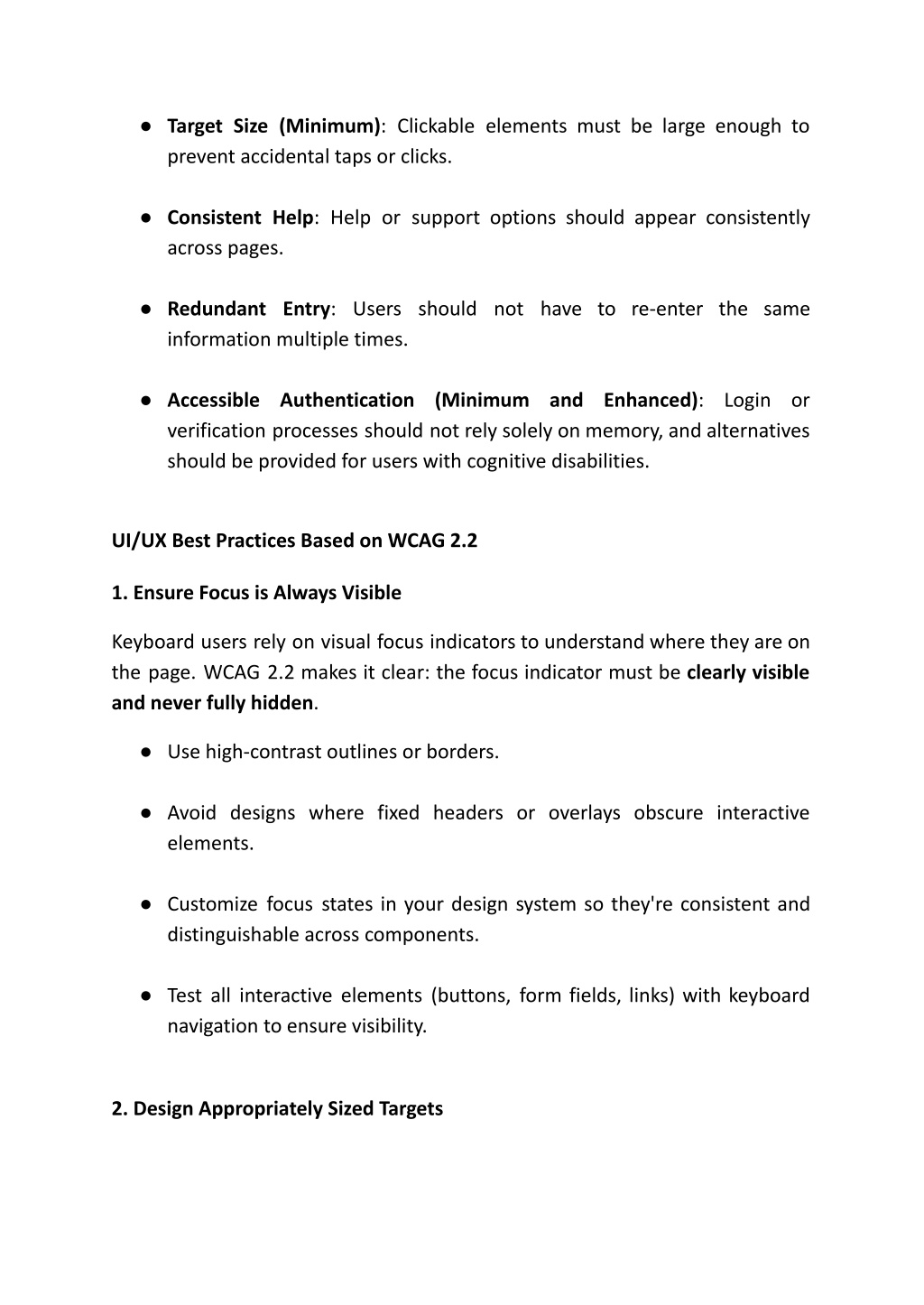 ● Target Size (Minimum): Clickable elements must be large enough to prevent accidental taps or clicks. ● Consistent Help: Help or support options should appear consistently across pages. ● Redundant Entry: Users should not have to re-enter the same information multiple times. ● Accessible Authentication (Minimum and Enhanced): Login or verification processes should not rely solely on memory, and alternatives should be provided for users with cognitive disabilities. UI/UX Best Practices Based on WCAG 2.2 1. Ensure Focus is Always Visible Keyboard users rely on visual focus indicators to understand where they are on the page. WCAG 2.2 makes it clear: the focus indicator must be clearly visible and never fully hidden. ● Use high-contrast outlines or borders. ● Avoid designs where fixed headers or overlays obscure interactive elements. ● Customize focus states in your design system so they're consistent and distinguishable across components. ● Test all interactive elements (buttons, form fields, links) with keyboard navigation to ensure visibility. 2. Design Appropriately Sized Targets