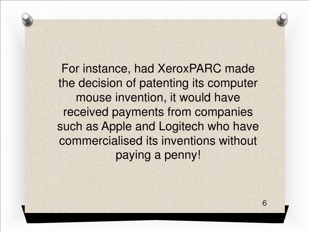For instance, had XeroxPARC made the decision of patenting its computer mouse invention, it would have received payments from companies such as Apple and Logitech who have commercialised its inventions without paying a penny! 6