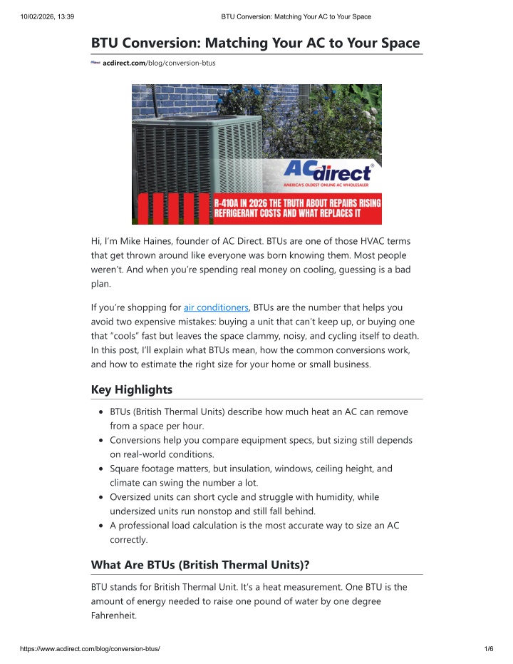 Choosing the right air conditioning system depends on accurate BTU calculations based on room size, insulation, ceiling height, and heat sources. Proper BTU matching ensures efficient cooling, lower energy bills, and longer system lifespan, while incorrect sizing leads to discomfort and wasted energy.<br>Find the right air conditioning system for your space with expert guidance at AC Direct.<br>