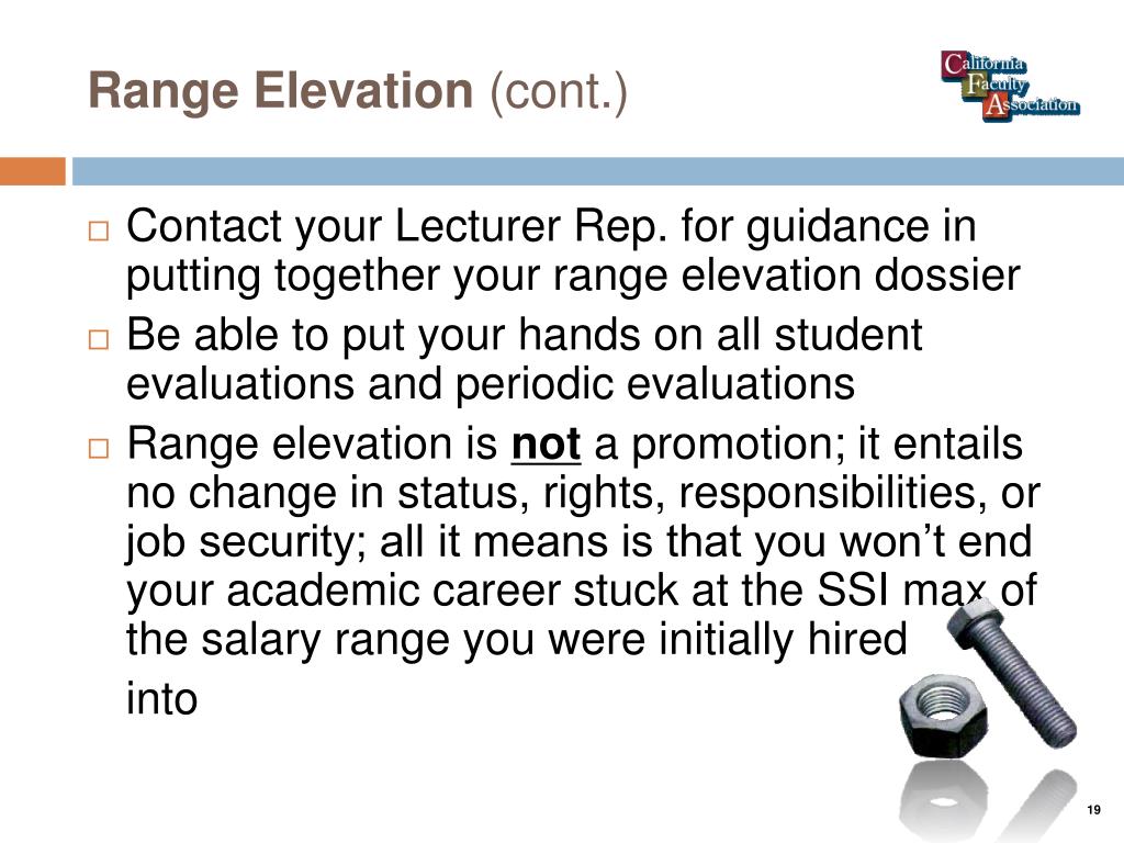Range Elevation (cont.) • Eligible lecturers must be notified at least 30 days prior to due date for materials (Art. 12.18) • Criteria for range elevation shall be appropriate to lecturer work assignments (Art. 12.19) • Recent arbitration win clarified: neither research nor terminal degree required for range elevation (if not part of assignment) • Denials shall be subject to appeal before a 3-member faculty committee, whose decision is final (Art. 12.20) 18