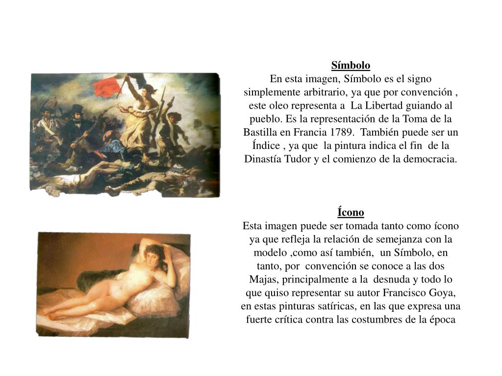 SímboloEn esta imagen, Símbolo es el signo simplemente arbitrario, ya que por convención , este oleo representa a La Libertad guiando al pueblo. Es la representación de la Toma de la Bastilla en Francia 1789. También puede ser un Índice , ya que la pintura indica el fin de la Dinastía Tudor y el comienzo de la democracia.ÍconoEsta imagen puede ser tomada tanto como ícono ya que refleja la relación de semejanza con la modelo ,como así también, un Símbolo, en tanto, por convención se conoce a las dos Majas, principalmente a la desnuda y todo lo que quiso representar su autor Francisco Goya, en estas pinturas satíricas, en las que expresa una fuerte crítica contra las costumbres de la época