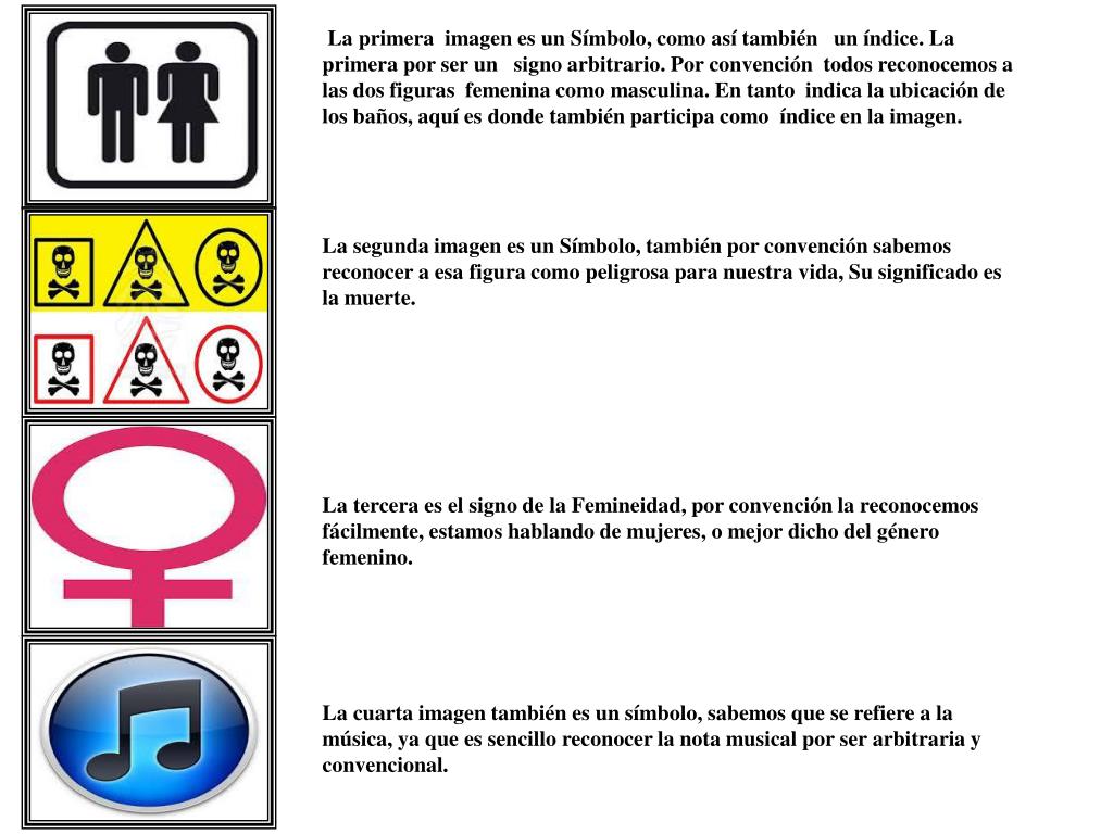 La primera imagen es un Símbolo, como así también un índice. La primera por ser un signo arbitrario. Por convención todos reconocemos a las dos figuras femenina como masculina. En tanto indica la ubicación de los baños, aquí es donde también participa como índice en la imagen.La segunda imagen es un Símbolo, también por convención sabemos reconocer a esa figura como peligrosa para nuestra vida, Su significado es la muerte.La tercera es el signo de la Femineidad, por convención la reconocemos fácilmente, estamos hablando de mujeres, o mejor dicho del género femenino. La cuarta imagen también es un símbolo, sabemos que se refiere a la música, ya que es sencillo reconocer la nota musical por ser arbitraria y convencional.
