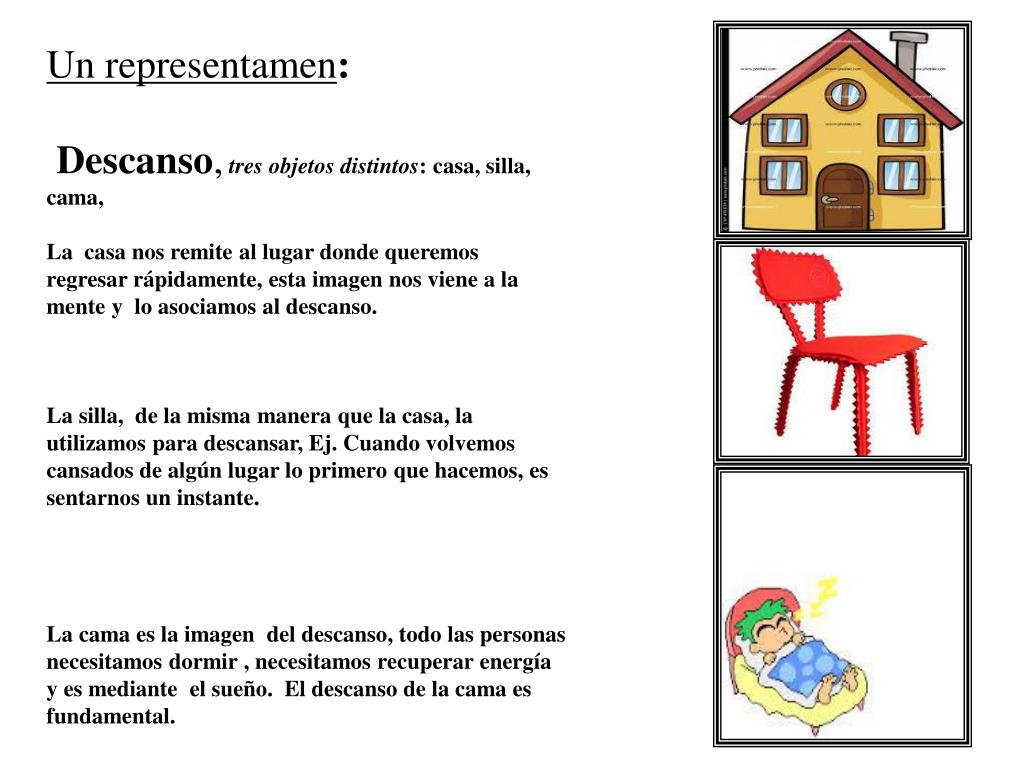 Un representamen: Descanso,tres objetos distintos: casa, silla, cama,La casa nos remite al lugar donde queremos regresar rápidamente, esta imagen nos viene a la mente y lo asociamos al descanso.La silla, de la misma manera que la casa, la utilizamos para descansar, Ej. Cuando volvemos cansados de algún lugar lo primero que hacemos, es sentarnos un instante.La cama es la imagen del descanso, todo las personas necesitamos dormir , necesitamos recuperar energía y es mediante el sueño. El descanso de la cama es fundamental.