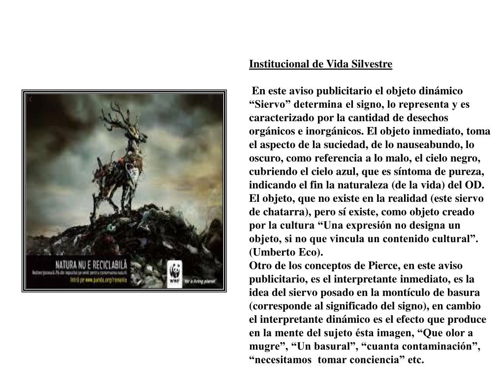 Institucional de Vida Silvestre En este aviso publicitario el objeto dinámico “Siervo” determina el signo, lo representa y es caracterizado por la cantidad de desechos orgánicos e inorgánicos. El objeto inmediato, toma el aspecto de la suciedad, de lo nauseabundo, lo oscuro, como referencia a lo malo, el cielo negro, cubriendo el cielo azul, que es síntoma de pureza, indicando el fin la naturaleza (de la vida) del OD. El objeto, que no existe en la realidad (este siervo de chatarra), pero sí existe, como objeto creado por la cultura “Una expresión no designa un objeto, si no que vincula un contenido cultural”. (Umberto Eco). Otro de los conceptos de Pierce, en este aviso publicitario, es el interpretante inmediato, es la idea del siervo posado en la montículo de basura (corresponde al significado del signo), en cambio el interpretante dinámico es el efecto que produce en la mente del sujeto ésta imagen, “Que olor a mugre”, “Un basural”, “cuanta contaminación”, “necesitamos tomar conciencia” etc.