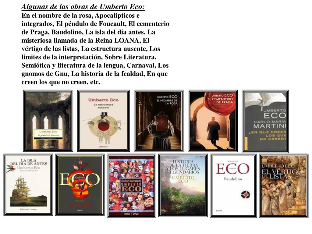 Algunas de las obras de Umberto Eco: En el nombre de la rosa, Apocalípticos e integrados, El péndulo de Foucault, El cementerio de Praga, Baudolino, La isla del día antes, La misteriosa llamada de la Reina LOANA, El vértigo de las listas, La estructura ausente, Los limites de la interpretación, Sobre Literatura, Semiótica y literatura de la lengua, Carnaval, Los gnomos de Gnu, La historia de la fealdad, En que creen los que no creen, etc.