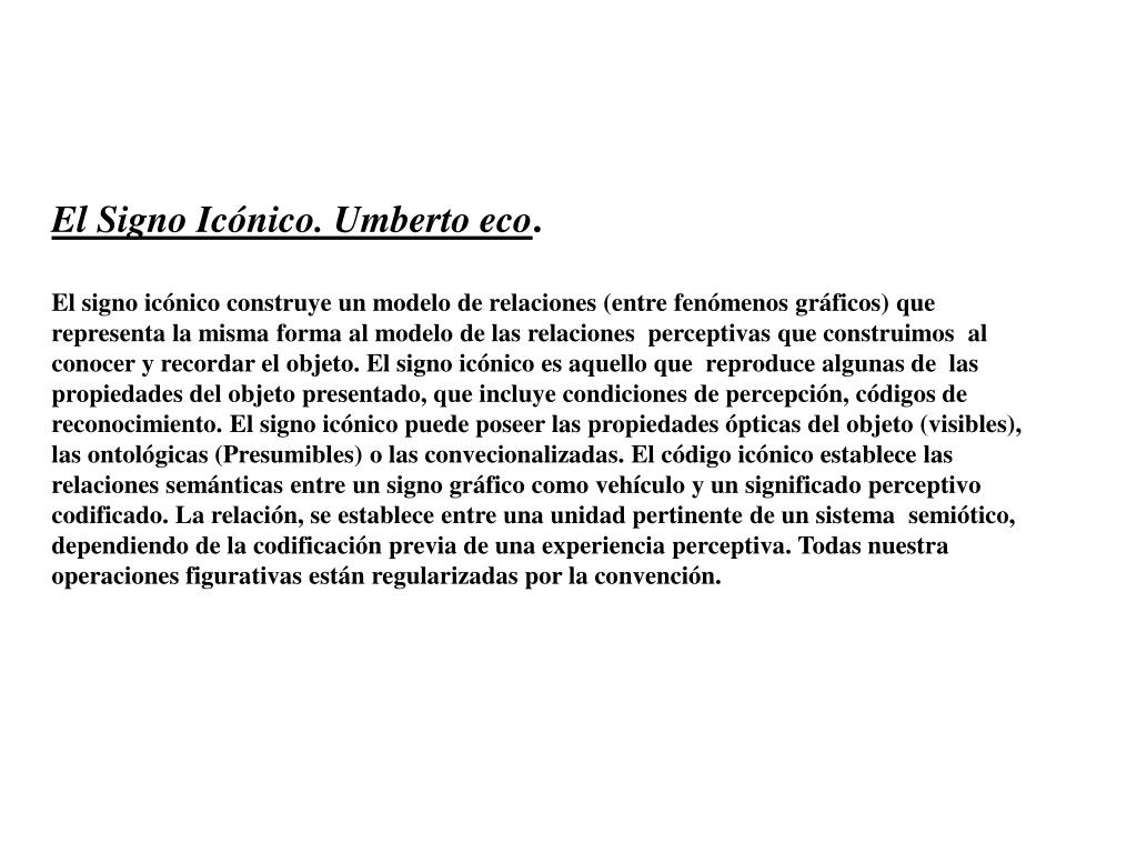 El Signo Icónico. Umberto eco.El signo icónico construye un modelo de relaciones (entre fenómenos gráficos) que representa la misma forma al modelo de las relaciones perceptivas que construimos al conocer y recordar el objeto. El signo icónico es aquello que reproduce algunas de las propiedades del objeto presentado, que incluye condiciones de percepción, códigos de reconocimiento. El signo icónico puede poseer las propiedades ópticas del objeto (visibles), las ontológicas (Presumibles) o las convecionalizadas. El código icónico establece las relaciones semánticas entre un signo gráfico como vehículo y un significado perceptivo codificado. La relación, se establece entre una unidad pertinente de un sistema semiótico, dependiendo de la codificación previa de una experiencia perceptiva. Todas nuestra operaciones figurativas están regularizadas por la convención.