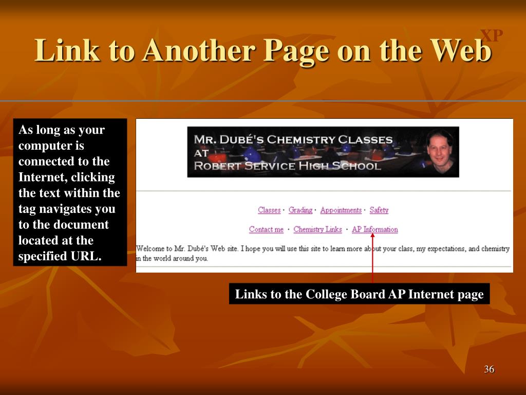 As long as your computer is connected to the Internet, clicking the text within the tag navigates you to the document located at the specified URL. Links to the College Board AP Internet page Link to Another Page on the Web
