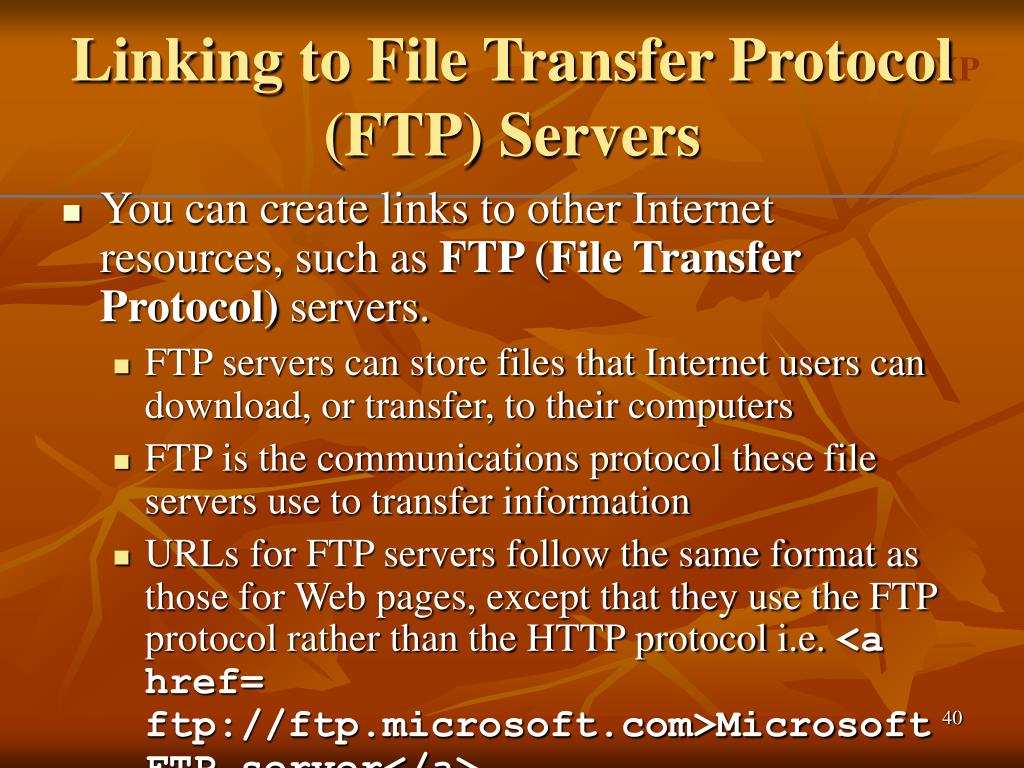 Linking to File Transfer Protocol (FTP) Servers • You can create links to other Internet resources, such as FTP (File Transfer Protocol) servers. • FTP servers can store files that Internet users can download, or transfer, to their computers • FTP is the communications protocol these file servers use to transfer information • URLs for FTP servers follow the same format as those for Web pages, except that they use the FTP protocol rather than the HTTP protocol i.e. <a href= ftp://ftp.microsoft.com>Microsoft FTP server</a>.