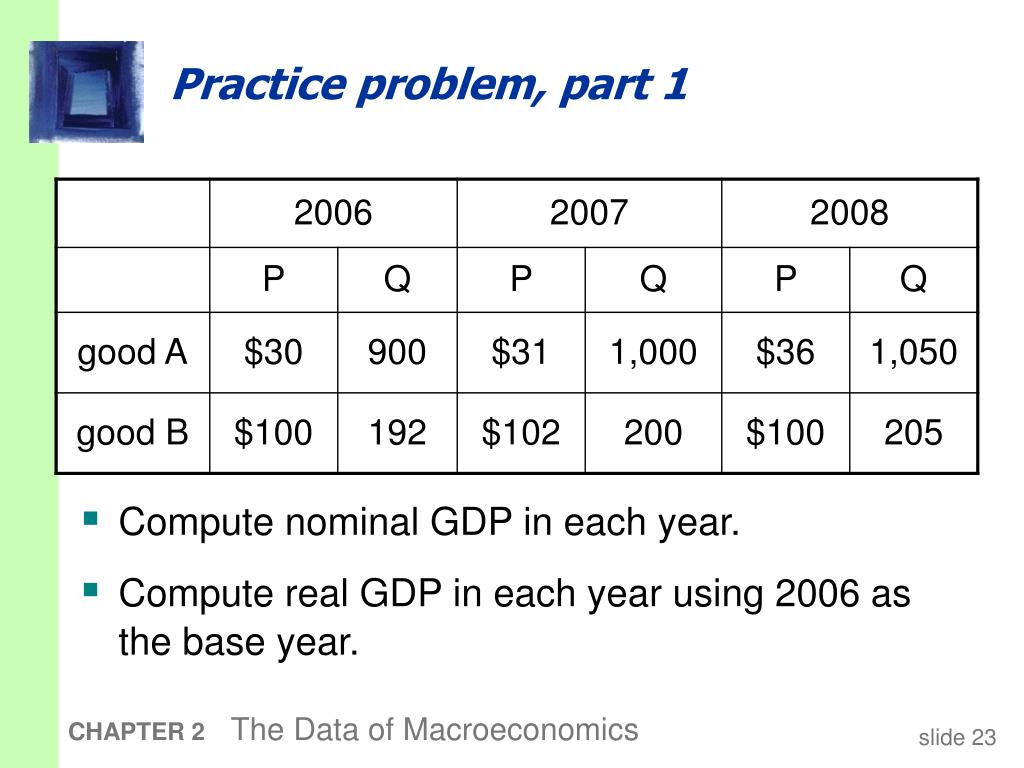 Practice problem, part 1 • Compute nominal GDP in each year. • Compute real GDP in each year using 2006 as the base year. CHAPTER 2 The Data of Macroeconomics